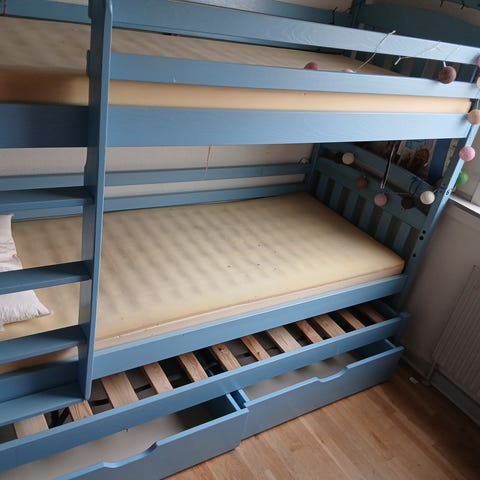 IKEA køjeseng i massivt fyrretræ med madrasser. Sengen har integreret stige i gavlen og sengehest på overkøjen for ekstra sikkerhed. Klassisk, ubehandlet/natur træfinish, som kan bruges som den er eller efterbehandles efter behov. Velegnet til børneværelse eller gæsteværelse med to sovepladser. Mål ifølge tegning: ca. 206 cm i længden, 97 cm i bredden og 161 cm i højden. Leveres med lamelbund; to madrasser medfølger i prisen. Står på Østfyn nær Tårup.