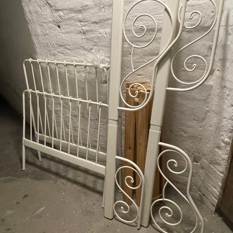 IKEA juniorseng i metal i rosa farve. Sengen har lamelbund i træ og metalramme med sider og gavl, der giver støtte. Velegnet til mindre børn, som er vokset ud af tremmeseng og skal over i en juniorseng.