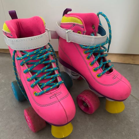 SFR Vision rulleskøjter til børn i str. 34. Klassiske side-by-side rulleskøjter med sort støvle og flerfarvede detaljer på siderne samt skakternet foring. Høj skaftkonstruktion med snørelukning giver støtte om anklen. Udstyret med fire hjul og bremseklods foran. Velegnet til rulleskøjteløb på glatte underlag som fx indendørs haller eller jævne udendørs overflader.