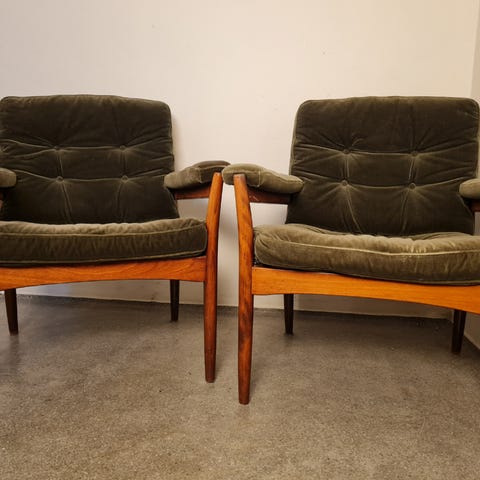 Flot patineret læder og god stand. På den ene stol er syningen dog gået op i den ene side. Behagelige at sidde i.