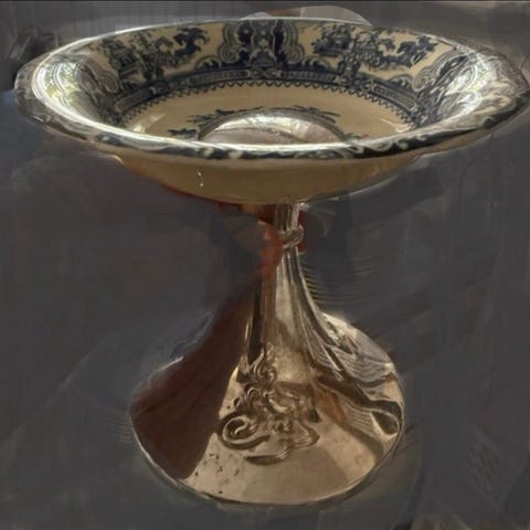 gl charmerende fransk fajanceopsats fad på piedestal i fajance og nysølv