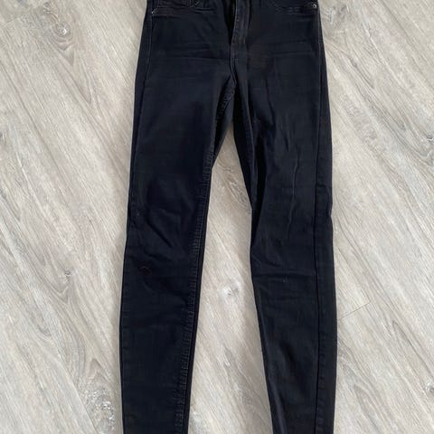 Sorte jeans/bukser i imiteret læder (skin look) m. en ’coated’ finish og høj talje. Bukserne har en figursyet pasform og stræk for komfort.