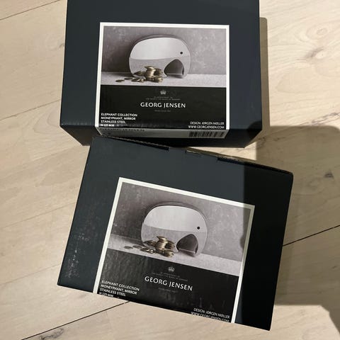 Georg Jensen Moneyphant sparebøsse med tvillinger i poleret stål og træ. Sættet består af en elefantformet sparebøsse i rustfrit stål samt to mindre træelefanter, der kan stå foran eller separat. Den store elefant måler ca. 17 cm i længden og ca. 12 cm i højden, de små træelefanter er ca. 7 cm høje. Egnet som sparebøsse og som dekorativt indretningselement i hjemmet, fx på børneværelse, kontor eller stue.
