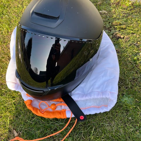 Hjelmen er brugt men i pæn stand og fungerer som den skal. Der er almindelige brugsspor, men ingen større skader.