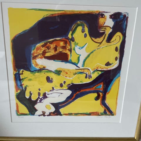 Abstrakt kunsttryk i ramme gul flerfarvet af Inge Hørup