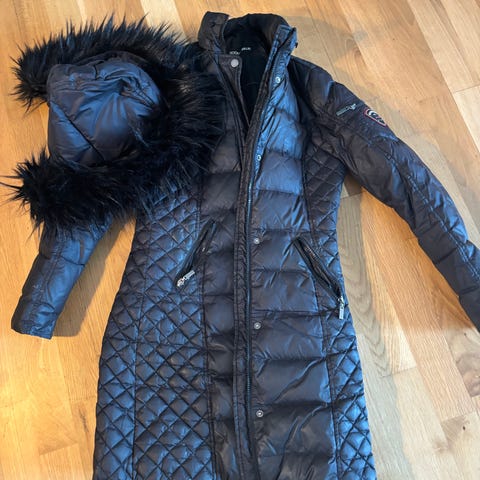 ROCKANDBLUE lang jakke til kvinder i str. 36. Jakken er sort og fremstillet i polyester. Den har gennemgående lynlås foran med trykknapper, quiltet mønster i siderne og glat vatteret panel midt for og bag. Hætten har aftagelig eller fast pelskant (fremgår af billederne). Jakken egner sig som overtøj til køligere vejr og giver god dækning på grund af den lange længde.