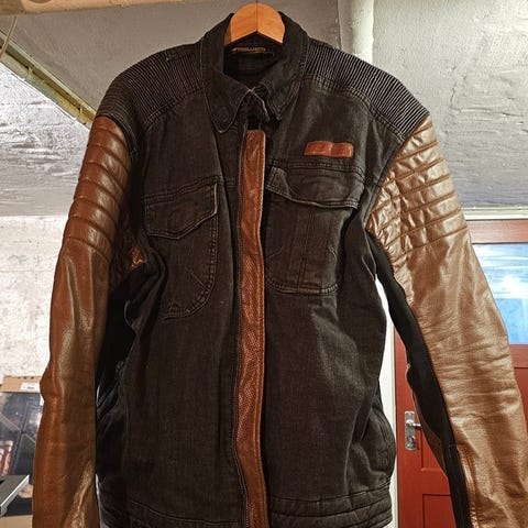 Sælger et par Trilobite motorcykel-jeans med aramid/Kevlar forstærkning og indbyggede beskyttere. Bukserne er lavet til kørsel på motorcykel men ligner almindelige jeans.