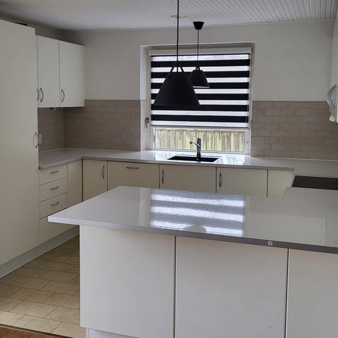 Køkkenet er funktionelt og har mange skabe og skuffer med god opbevaringsplads samt en stor hjørnebordplade.
