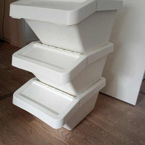 IKEA børneopbevaring med plastkasser hvid og rosa