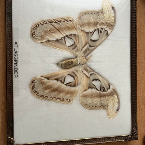 udstoppet Atlasspinder (Attacus atlas), som er en af verdens største natsommerfugle (natsværmere) ramme med glas front.