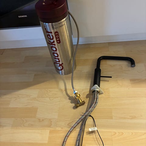 Quooker PRO3-VAQ E varmtvandsbeholder med en kapacitet på 3 liter. Beholderen er i rustfrit stål og er mærket til 800 kPa (8 bar), 1600 W og 230 V / 50 Hz. Sættet omfatter beholder samt tilhørende armaturdele og slanger, som på billederne. Velegnet til installation i køkken for øjeblikkeligt varmt vand fra hanen.