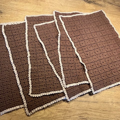 🟩🧶🟧 Ægte vintage håndarbejde. Brugt, så der kan forekomme kaffepletter og mindre skader, huller og slid, så se venligst alle billeder for stand. Kan bruges som de er, men kan måske også bruges til noget kreativt krea projekt?
