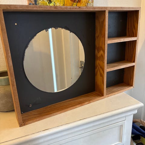 Spejl med lakeret bøgetræsramme 80 cm. I diameter. Spejlet er fra et af de 1. År Ikea var i Danmark altså fra 70’ erne. Som man kan se, sælges spejlet Gr. Flytning.