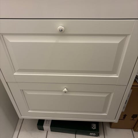 IKEA badeværelsesmøbel med vask består af et væghængt skab i lys trælook med to skuffer samt en hvid rektangulær vask/vaskeplade med integreret bassin og hul til armatur. Skabet er beregnet til montering under vasken og giver opbevaringsplads til badeværelsesartikler. Velegnet til brug i badeværelse eller gæstetoilet, hvor der ønskes et enkelt og lyst udtryk.