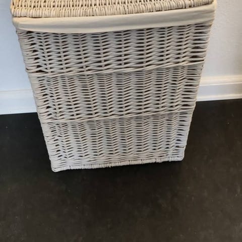 Vasketøjskurv i flettet materiale med rundt låg og hank. Kurven er grå og har en aftagelig hvid stofpose/indersæk, der bindes fast med bånd langs kanten. Egnet til opbevaring af vasketøj.