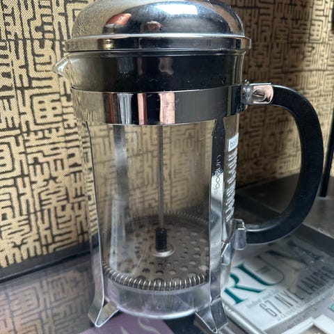Bodum stempelkande i glas og metal. Kanden har glaskolbe med metalstel og metalfilter samt sort håndtag. Velegnet til brygning af kaffe ved hjælp af stempelmetoden i køkken eller kontor. Den kan indeholde 1 l