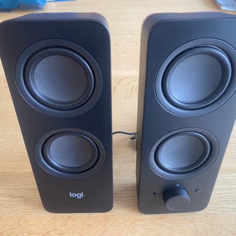 Logitech bærbare USB-højttalere med etui. Sættet består af to kompakte højttalere, der opbevares i et hardcase-etui med lynlås. Højttalerne tilsluttes via USB-kabel, som både kan bruges til strøm og lyd på kompatible enheder. Designet gør dem egnede til brug sammen med bærbar computer eller stationær pc, hvor der er behov for eksterne højttalere i et transportabelt format.