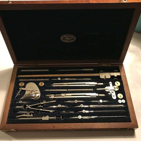 Andre samleobjekter, passersæt, Ældre passersæt. KIN 521 Made in Czechoslovakia. Fungerer men også fint i en lille udstilling eller som objekt på et skrivebord med det smukke røde betræk Låsen let i stykker og brugsspor på etuiet. Kassen måler 15x6cm