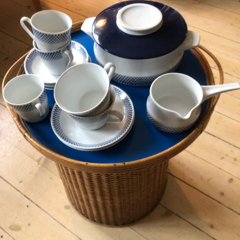 Lyngby porcelæns rhombe. Aldrig brugt. Etagerne består af to runde tallerkener i forskellig størrelse, der samles med medfølgende stang. Velegnet til servering af kager, småkager, frugt eller andre anretninger på bordet. Designet er enkelt og neutralt, så det passer ind i mange typer service og borddækning.