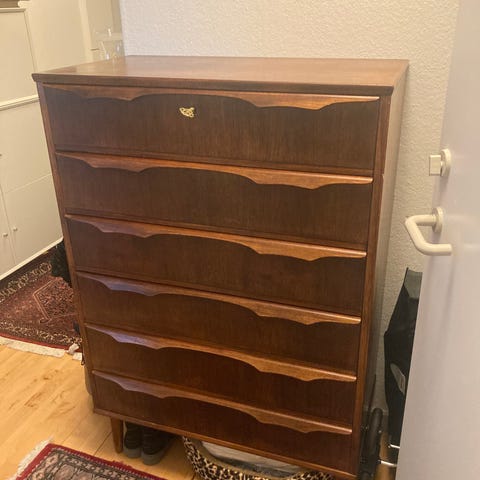Flot velholdt teaktræ kommode med 6 skuffer som køre godt. Mål: 85 b 41 d 107 h.
