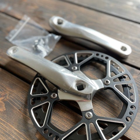 Rotor cykelkranksæt i aluminium med 24 mm aksel (7075-CNC). Kranksættet har to kæderinge og 170 mm krankarme. Farven er sort. Velegnet til cykler med kompatibel krankboks og 24 mm krankaksel. Kæderingene er monteret med bolte omkring akslen, og konstruktionen er lavet i CNC-bearbejdet aluminium for lav vægt og stivhed. Klinger aldrig kørt. Pedal arme kørt 200 km.
