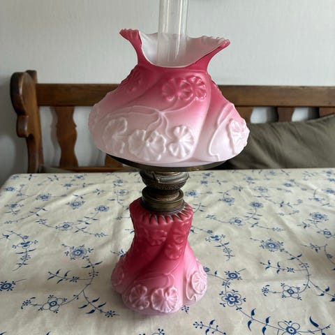 Lyserød og hvid petroleumslampe, olielampe, bordlampe,