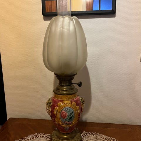 En super smuk lyserød og hvid petroleumslampe med håndmalede blomster. I god stand og ingen skår.