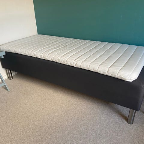 Sengen står på ben, der danner et fladt U-stel, hvilket giver et enkelt og moderne udtryk. God og stabil konstruktion. Topmadras medfølger.