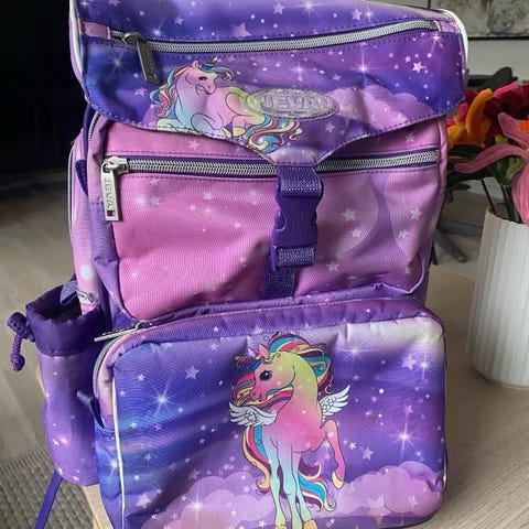 Skoletaske med tilhørende idrætstaske, som kan klipses sammen.