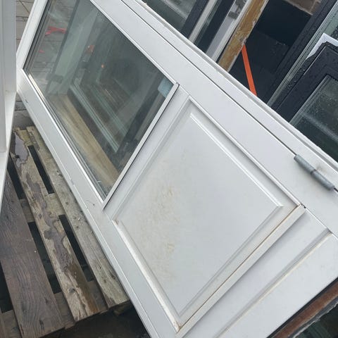 Udvendig terrassedør med glasfelter og sprosser. Døren har sort yderside og hvid inderside. Der er udskæring til låsekasse og greb, som desværre sidder skævt. Egner sig til brug som terrassedør eller havedør i bolig, udestue eller lignende. Derudover er der skruehuller efter vores alarm. Måske nogen kan bruge den alligevel eller dele af den.