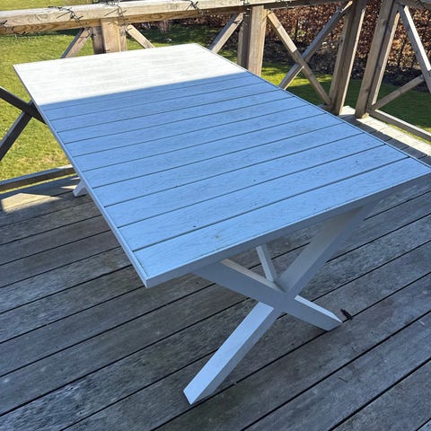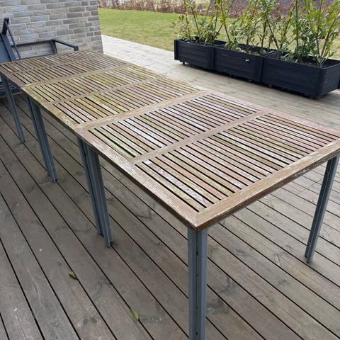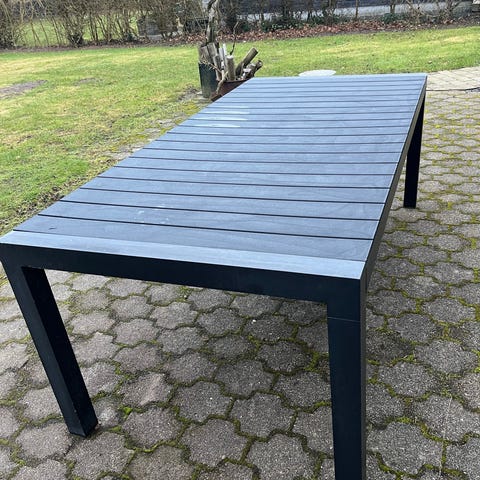 Rektangulært havebord i sort. Bordet har plade med lamel-look i et materiale, der ligner træ eller komposit, og et stel i metal. Velegnet som udendørs spisebord på terrasse eller i have. Der medfølger 5 grålige stole og hynder (hvis ønskes).