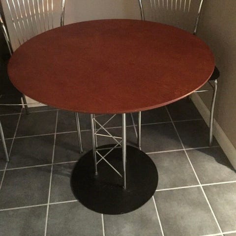 Rundt 120 ø teaktræs spisebord, med 2 tillægsplader, så bliver længden i alt 230 cm.