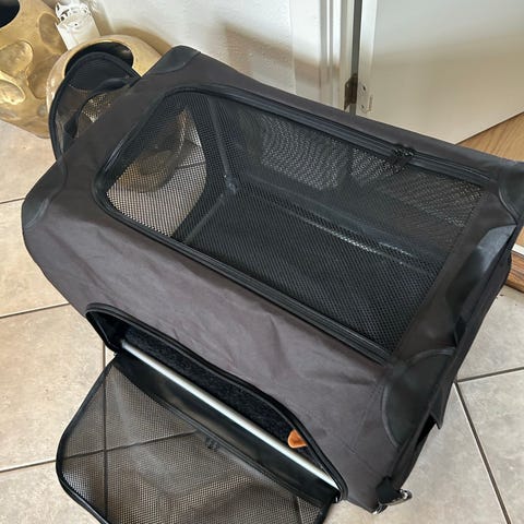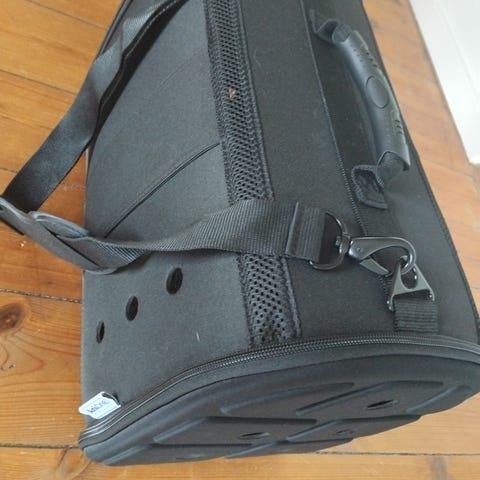 AniOne transporttaske til kæledyr i sort tekstilmateriale. Tasken har bærehank og justerbar skulderrem samt ventilationshuller og netindsatser i siderne for luftcirkulation. Velegnet til transport af mindre kæledyr som f.eks. kat eller lille hund.