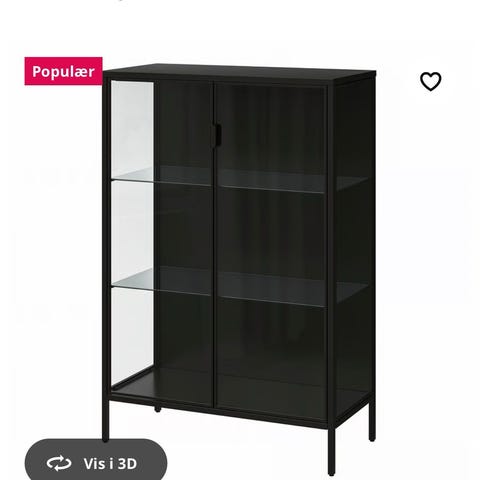 IKEA vitrineskab i hvidt design med glaslåger øverst og nederst samt en lukket midtersektion. Øverste del har glashylder, som egner sig til opbevaring og udstilling af fx glas, figurer eller andre små genstande. Nederste del har glaslåge med plads til bøger eller dekoration. Skabet er velegnet til stue, spisestue eller kontor, hvor der er behov for både opbevaring og udstilling af indholdet.