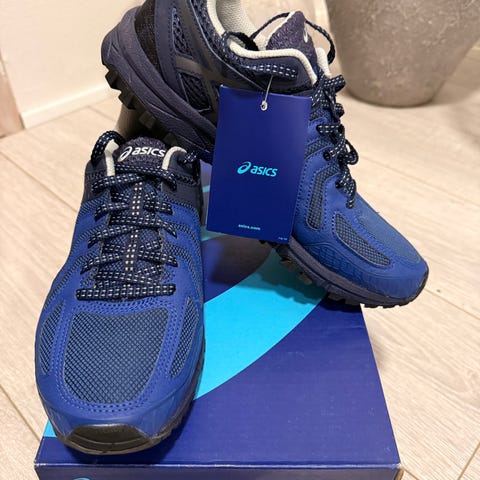 Asics løbesko i størrelse 37. Skoene er i navy/blå med koralfarvede detaljer og hvid mellemsål. Overdelen er i åndbart mesh med snørelukning. Ydersålen har mønster, der giver greb ved løb. Velegnet til løb og anden træning.