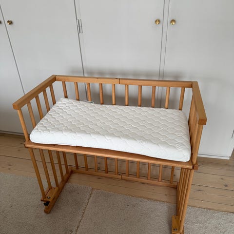 Pæn og slebet bedside babyseng med rullehjul
