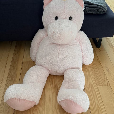 Kæmpe pegasus enhjørning bamse (dog uden horn) i lyserød på 140 cm i længden ønsker sig et nyt hjem med en ny legekammerat.