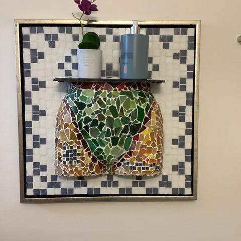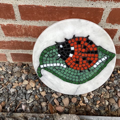 Hus nr i mosaik pyntet på skifferplade 10-20 cm. Stk 50 kr.