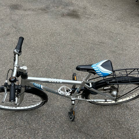 Børnecykel med 24" hjul i lilla farve. Cyklen har lige styr og standard sadel. Der medfølger dæk/skærme og en lilla cykelhjelm, som ses på billederne. Velegnet til børn fra 8-10 år