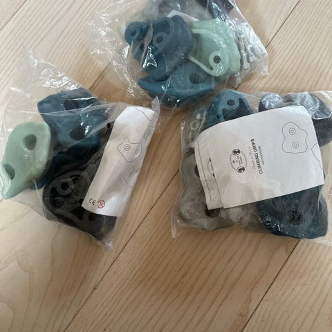 Sæt klatregreb i grå farve med tilhørende skruer. Velegnet til montering på klatrevæg eller legetårn. Grebene har flere huller til fastgørelse og kan placeres i forskellige mønstre for at tilpasse sværhedsgraden. Materiale og nøjagtigt antal greb er ikke oplyst, men sættet indeholder både greb og monteringsskruer som vist på billedet.