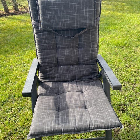 Flot og velholdt havemøbelsæt i grå med 4 lækre positions stole inkl. hynder.