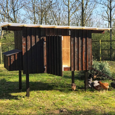 Træ hønsehus med skråt tag og udvendige redekasser