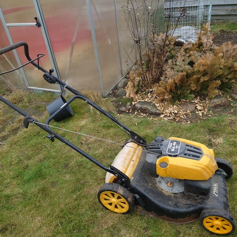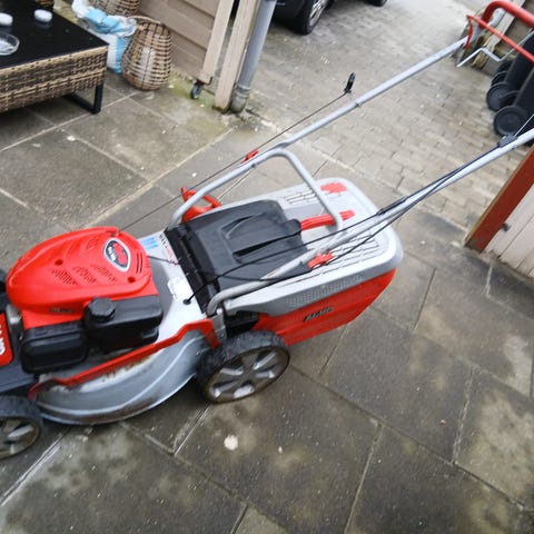 Plæneklipperen er udstyret med opsamler bagpå og store hjul, som giver stabil kørsel på græsplænen.