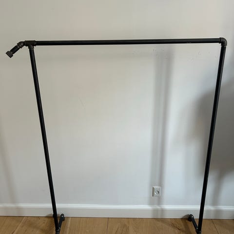 Gulvstående tøjstativ i mørke upolerede vandrør.