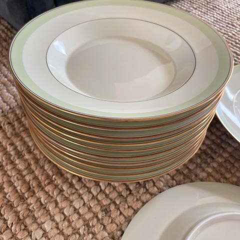 Royal Copenhagen skåle med underkopper i porcelæn. Sættet består af to skåle med tilhørende underkopper. Skålene er hvide med lysegrøn kant og guldfarvet linje langs kant og fod. Diameteren på skålene fremgår af målebåndet på billedet. Velegnet til servering af fx suppe, dessert eller småretter. Bundstempel fra Royal Copenhagen ses på undersiden.