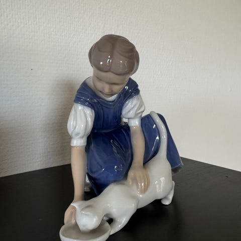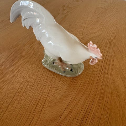 Bing & Grøndahl figur af høne i porcelæn. Figuren står på en oval fod og er dekoreret i lyse nuancer med mørkere detaljer på hale og vinger. Undersiden er mærket med B&G-stempel og modelnummer 2193. Egnet som dekorativ porcelænsfigur i hjemmet eller som del af en samling af dyrefigurer.