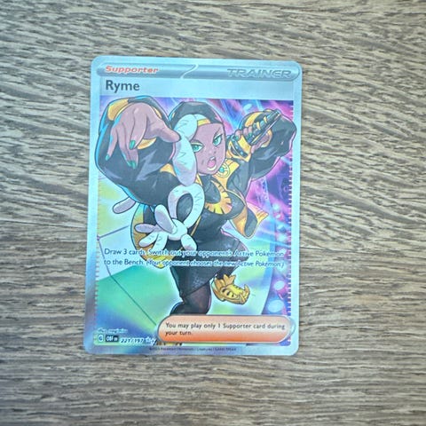 Pokémon Rhyme Trainer kort i holo/foil-version. Motivet viser træneren Rhyme på forsiden, og bagsiden er standard Pokémon-kortbagside. Egnet til samling og brug i Pokémon Trading Card Game.