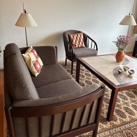 Elegant sofasæt bestående af 2 stk. topersoners tremmesofaer, arme i massiv egetræ og koldskums indlæg i hynderne samt stof med høj slidstyrke.