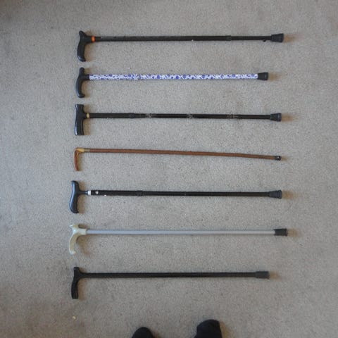 3 træstokke med forskellig højde, sam 1 aluminiums stok, der kan indstilles i højden. Bemærk, slidtage