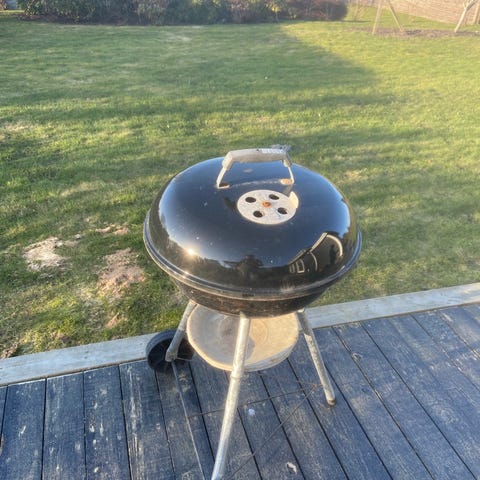 Kuglegrill i sort med låg og bund i metal. Grillen står på stativ med tre ben og to hjul, så den kan flyttes rundt på terrassen. Under grillen er der en opsamlingsbeholder til aske. Velegnet til udendørs madlavning i have eller på terrasse med kul eller briketter som brændsel.